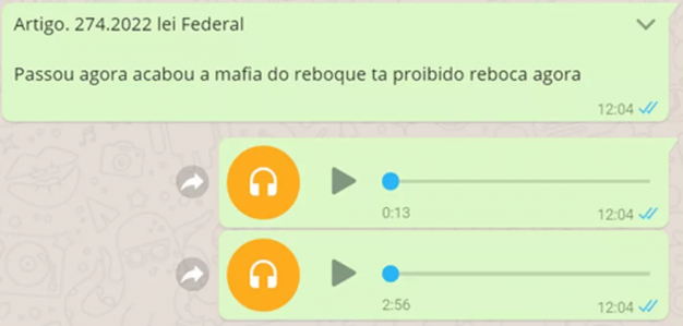 Circula em grupos de WhatsApp uma mensagem que diz que uma nova legislação proíbe rebocar veículos a partir de agora. Não é verdade. A mensagem é acompanhada por um áudio de entrevista em que um homem defende esse ponto de vista.